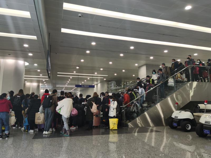 下午2時30分,記者看到,俄航某(mǒu)進(jìn)境航(háng)班旅(lǚ)客正在國際到達區域進行健康申報、測溫等工作。旅客們從下飛機到完成(chéng)各個排查流程,可能需要數個(gè)小時(shí)。而後續航班即便已經(jīng)抵達,旅客或(huò)許也暫時無法下機,他們要等到前道航班完成(chéng)所有(yǒu)檢疫排查之後才能開啟進境申報流(liú)程。記者看到,雖然旅(lǚ)客等候的時間很長,但他們(men)多非常配合,而衛生檢疫(yì)一線的海關關員麵對長(zhǎng)長的隊伍(wǔ)以及後續可能要排查到半夜的航班,其(qí)嚴防嚴控力度絲毫不鬆(sōng)。非常時期,安全與便(biàn)利,不應有(yǒu)所調和。